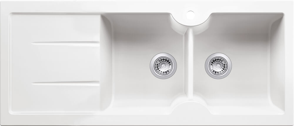 Cuisine 1160 x 500 Inset / Undermount Fine Fireclay Gloss White Sink – Double Bowl and Single Drainer